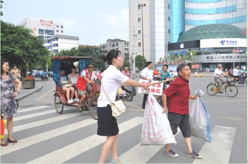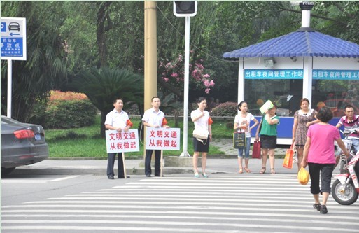 一大早学雷锋志愿服务队6人统一着装,并佩戴“文明劝导员”的红袖套,顶着烈日,走上街头,在郫县南门政务中心十字路口和北门老成灌路十字路口两个繁华、行人密集的路段,做起了文明交通劝导员,并时刻提醒和告诫过往行人要自觉摒弃不文明陋习,过马路时坚决做到红灯停、绿灯行,且须在斑马线安全区域内行走。在文明劝导过程中,绝大多数市民能够迅速纠正不文明的行为,积极遵守交通规则。