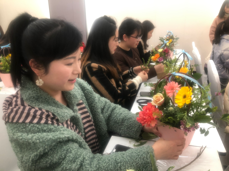 上午10点,活动正式开始,专业的花艺老师为大家详细教授辨认花的种类、讲解插花技巧、演示插花艺术颜色搭配等。随后,花艺老师通过现场操作,学员们跟着花艺老师的讲解认真进行实操,花艺老师逐一认真指导。30分钟不到,一份份漂亮花艺作品呈现在面前,大家脸上洋溢着成功的喜悦,纷纷拍照发朋友圈向亲朋好友分享自己的作品。