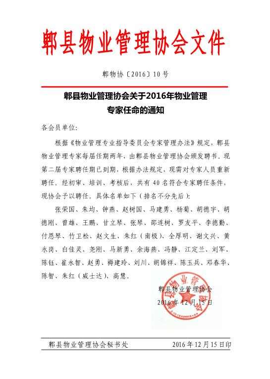 郫县物业管理协会关于2016年物业管理专家任命的通知